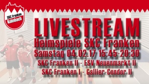 Zum Heimspiel-Jahresauftakt des SKC Franken präsentiert der SKC Franken wieder einen Livestream. Den Anfang macht um 15:45 die zweite Mannschaft mit dem Spiel gegen den ESV Neuenmarkt III in der Kreisklasse B1. Die Gäste konnten zuletzt den zweiten Saisonsieg feiern und stehen mit 4 Punkten am Tabellenende. Auf dem Papier eine leichte Aufgabe für den Tabellenführer der Mit Andreas Busse, Patrick Drechsel, Steve Crivellaro, Sabine Popp, Monika Sandler und Mannschaftsführer Michael Jonak aus den vollen Schöpfen kann.
