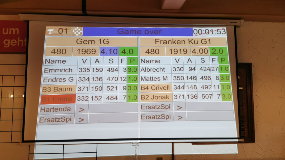 Zum Saisonstart gab es keine Punkte für die Franken-Reserve. Das Spiel eröffneten Uli Albrecht und Melvin Mattes. Uli fand nicht richtig zu seinem Spiel und musste seinen Mannschaftspunkt abgeben. Für Melvin lief es nebenan jedoch hervorragend. Mit konstantem Spiel landete er mit 496 einen neue persönliche Bestleistung und verhinderte die Vorentscheidung zu Gunsten der Gastgeber. Nach einem 1:1, bei 44 Holz Rückstand zur Halbzeit, bleib dann die nötige Aufholjagd aus. Zwar sicherte der beste Kulmbacher, Michael Jonak mit einem 3:1 (507) einen weiteren Punkt. Bei den Gesamtholz erhöhten die Gastgeber zum Ende nochmals leicht und besiegelten damit die Niederlage der Gäste.