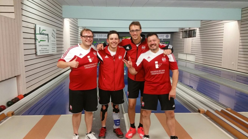 Im "Abendspiel" der Kreisklasse Nord empfing der SKC Franken I den PTSV 1962 Hof II. René Hinz und Michael Hornig machten den Anfang für die Gastgeber und starteten den ersten Durchgang mit einem Paukenschlag. Mit 147 und 158 Holz, waren nach den ersten 30 Schub bereits 80 Holz Vorsprung herausgespielt. Beide konnten jedoch nachfolgend das hohe Niveau nicht halten mit 507 und 522 Holz wurden jedoch solide Ergebnisse erzielt. René Hinz (507) gewann den ersten Mannschaftspunkt, Michael Hornig musste drei Sätze knapp abgeben und verpasste trotz 30 Holz mehr als sein Gegner den Mannschaftspunkt. Mit 1:1 und 88 Holz Führung zur Halbzeit ging es für Marco Jonak und Max Grampp in die Schlusspaarungen. Zu einem Sieg musste dann mindestens ein Mannschaftspunkt her und die Führung durfte nicht abgegeben werden. Max kam dann mit 144 Holz glänzend ins Spiel und holte den ersten Satzpunkt. Marco tat sich nebenan schwerer. Er verpasste den ersten Satz mit 8 Holz. Im zweiten Satz lief es umgekehrt. Max hatte mit 117 Holz einen "Ausreißer" nach unten. Marco setzte auf 1:1 mit 120 Holz. Im dritten Satz musste Marco mit 114:134 den zweiten Satzpunkt abgeben. Max fand nebenan wieder in sein Spiel und holte das 2:1 mit 147 Holz. Er musste im letzten Satz seine 46 Holz Vorsprung zum Sieg nur noch halten. Er legte dann mit 141 Holz nochmal Bärenstark nach und holte weitere 11 Holz auf seinen Gegner, sowie das 3:1 zum 2. Mannschaftspunkt der Gastgeber. Mit 549 Holz konnte er abermals überzeugen und die Tagesbestleistung spielen. Auch Marco Jonak konnte mit 137:129 einen Satzpunkt zum 2:2 gewinnen. Ihm fehlten jedoch 15 Holz zum Gewinn des Mannschaftspunktes. Am Ende konnte ein doch deuticher 4:2 (2060:1929) Heimsieg gefeiert werden. Der SKC Franken bleibt somit mit drei Siegen aus drei Spielen Tabellenführer der Kreisklasse Nord.