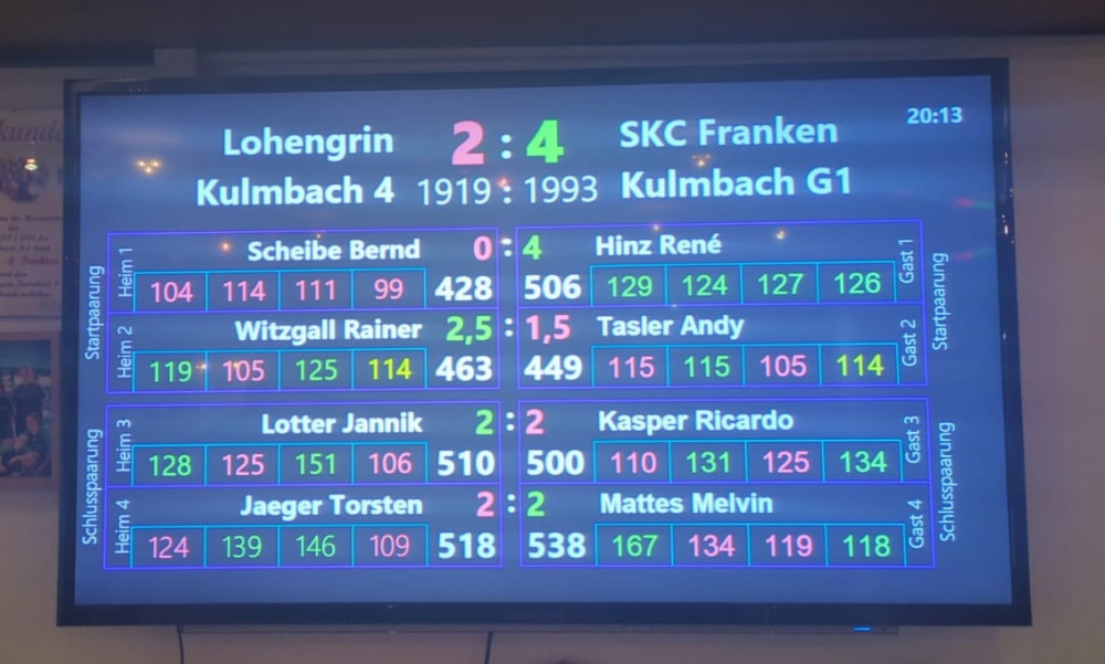Nach langer Terminfindung ging es heute auf den uns besten bekannten Bahnen gegen Lohengrin Kulmbach 4 darum wichtige Punkte gegen den Abstieg einzufahren. Die Aufstellung - aus der Not geboren - brachte in der Kombination Hinzi und Andy gegen Bernd Scheibe und Rainer Witzgall ein 3:1 mit +64 Holz für die Schlußpaarung. In ausgeglichenen Duellen zwischen Jannik Lotter gegen Ric (510:501 Holz) und Torsten Jaeger gegen den wieder überzeugenden Melbert (518:538) teilten sich die Spieler die Punkte, aber Dank des besseren Gesamtergebnis stand zum Schluß ein 4:2 mit 1994 zu 1919 Holz für die Franken auf der Anzeigetafel. Ein wichtiger Sieg mit wichtigen Punkten.