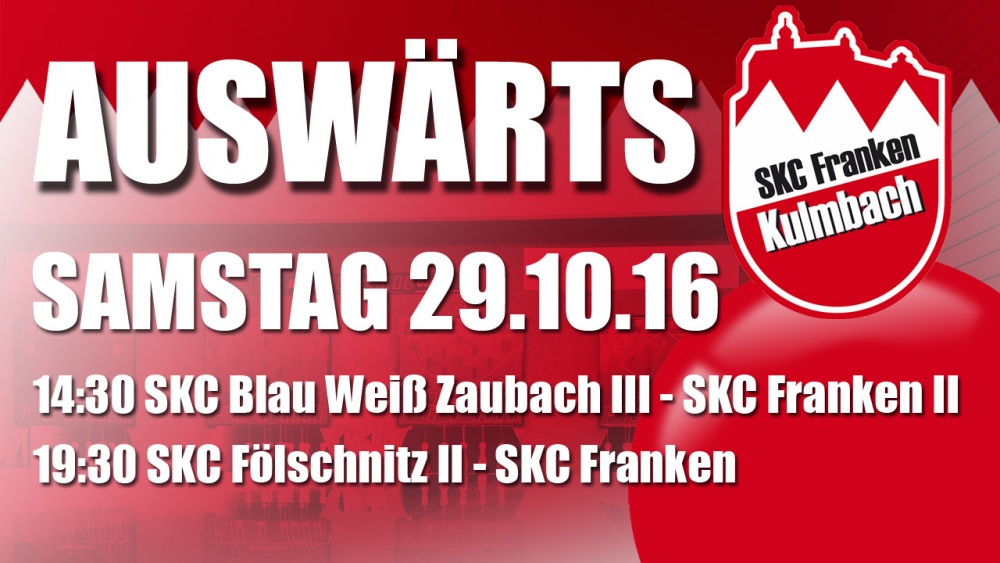 Die erste Mannschaft reist als Tabellenführer zum Verfolger, der Reserve des SKC Fölschnitz. Das Spitzenspiel der Kreisklasse Nord startet um 19:30. Die Gastgeber ließen am vergangen Spieltag mit 2131 Holz in Schwarzenbach aufhorchen und spielten eine neue Saisonbestleistung der Kreisklasse. Sollten die Gastgeber dieses Niveau halten können wird es sehr schwer werden die weiße Weste zu wahren. Für die Verteidigung der Tabellenführung stehen René Hinz, Michael Hornig, Marco Jonak und Maximilian Grampp im Aufgebot.