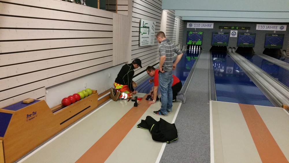 Nein, natürlich nicht. Durch den beherzten Einsatz mit einer klasse Montagsleistung außerhalb des aktiven Kegelsports, konnten Opi und Maximum den Defekt beheben. Der Sensor an der Lichtschranke für den Übertritt auf Bahn 1 ging nicht mehr.
