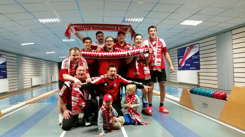 Mit dem Auswärtssieg am letzten Spieltag beim KV Lohengrin IV im Gründla machte der SKC Franken die dritte Meisterschaft (nach 2014 Kreisklasse C und 2015 Kreisklasse B) in folge perfekt und schaffte damit einen weiteren Durchmarsch in die Kreisklasse. Es starteten dann zunächst René Hinz und Michael Hornig für den SKC Franken. Die beiden konnten mit 216 und 204 einen soliden Start hinlegen und nach 50 Schub ihre Mannschaft bereits mit 40 Holz in Führung bringen. Im zweiten Durchgang ließen beide gerade im Abräumen ein paar Holz liegen, hielten jedoch mit 407 und 386 Holz die Führung. Im zweiten Drittel kam Andreas Busse dann zunächst auf die Vollen nicht richtig ins Spiel. Er rettete seinen Durchgang mit einer starken Abräum-Leistung noch auf 198 Holz. Nebenan konnte Patrick Drechsel mit starken 218 Holz glänzen. Zur Halbzeit führte der SKC Franken somit bereits mit 81 Holz. Der zweite Durchgang im Mittelpaar lief nochmals ausgezeichnet für die Franken. Andreas Busse konnte mit 233 Holz auf Bahn 4 nochmal richtig aufdrehen und setzte sein Endergebnis auf 431 Holz. Patrick Drechsel kam am Ende auf 407, was eine 138 Holz-Führung vor den Schlussdurchgängen zur Folge hatte. Die dritte Meisterschaft lag somit bereits in der Luft und die Stimmung bei Mannschaft und Fans brodelte gewaltig. Der erste Durchgang der Schlusspaarung sorgte dann für die definitive Vorentscheidung. Marco Jonak konnte mit 205 Holz seinen Gegner Christian Vitzthum halten. Max Grampp spielte von der ersten bis zur letzten Kugel wie entfesselt auf und kam auf 252 Holz. Die Holz-Jagd bescherte 50 Kugeln vor Schluss dann bereits eine 200 Holz-Führung für den SKC Franken. Alle hofften jetzt noch auf den 500er von Max. Er konnte dann sein Spiel 1:1 im zweiten Durchgang fortführen und unter tosendem Applaus der Zuschauer mit weiteren 250 Holz ein Endergebnis von 502 Holz auf die Bahnen zaubern. Damit spielte er im letzten Spiel im 100 Kugel-Modus das beste Einzelergebnis eines Spielers des SKC Franken bisher. Er schaffte damit auch die Saisonbestleistung in der Kreisklasse A, wie auch die Saisonbestleistung im gesamten Kreis Nord. Marco Jonak legte nebenan nochmal mit 208 Holz nach und kam auf ein Endergebnis von 413 Holz. Am Ende gewann der Meister mit 2546:2295, mit 249 Holz vor den Gastgebern.