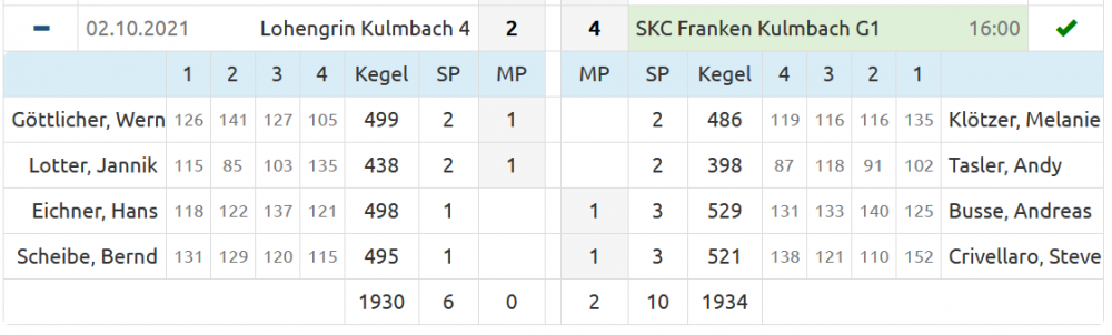Mit einem starken Schlusspurt konnte die zweite Mannschaft den ersten Saisonsieg einfahren. In engen Duellen im Startpaar mussten die "Roten" beide Mannschaftspunkte der Heimmannschaft überlassen. 54 Holz Rückstand erschwerte die Aufgabe für das Schlusspaar Busse/Crivellaro zusätzlich. Andi konnte dann schnell das 2:0 markieren und 25 Holz Rückstand zurückerobern. Steve hielt sich nach den ersten Beiden Durchgängen mit 1:1 im Rennen und erspiele 2 Holz auf seinen Gegner. Im dritten Satz verpasste Andi knapp den vorzeitigen Mannschaftspunkt. Mit 133:137 musste er das 1:2 hinnehmen. Steve erhöhte mit 121:120 auf 2:1. Im letzten Durchgang lief die Aufholjagd weiter. In einem hoch spannenden Finale konnte Andi mit 131:121 seinen Punkt sichern. 31 Holz wanderten dabie auf das Konto der Gäste. Mit 138:115 gelang Steve ebenfalls der Punktgewinn. Das Spiel endete mit 1930:1934, bei zwei gewonnenen Mannschaftspunkten zum knappen 2:4 Auswärtserfolg der "Dreibrunnen"-Reserve.